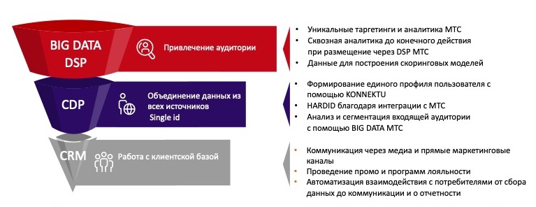 По словам Романа Носова, CDP-платформа МТС и KonnektU работает на всех этапах всех этапах воронки конверсий в Digital: от привлечения аудитории до работы с клиентской базой.