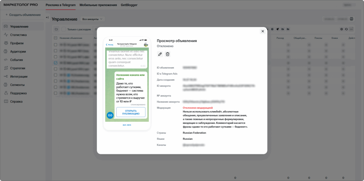 Чаще всего МТС отклоняет креативы из-за технических ошибок: пустые или неправильно заполненные поля, нестандартные эмодзи, переносы строк, битые ссылки, запрещённые формулировки. Например, объявление могут завернуть, если в тексте есть кликбейт, провокации или призывы в духе «Жми» и «Скоро всё». Ключевое отличие от Telegram Ads — обратная связь. В МТС Маркетолог PRO указывают причину отказа.