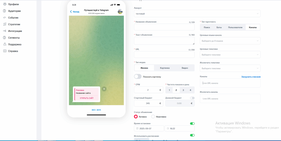 В отличие от базового кабинета Telegram Ads, здесь можно не только запустить кампанию, но и управлять аудиторией, ставками и результатами на всех этапах работы. МТС Маркетолог PRO даёт возможности, которых в Ads просто нет: можно использовать сегменты Big Data от МТС, работать со своей базой контактов, создавать сложные сегменты, запускать ретаргет и настраивать автоматические стратегии. Всё это экономит время и помогает точнее попадать в нужную аудиторию.