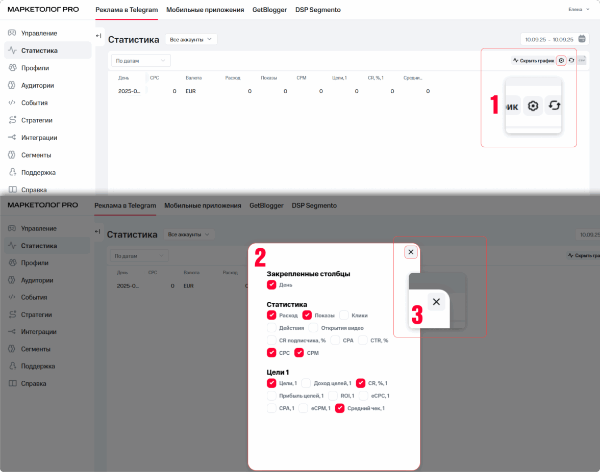 Интерфейс МТС Маркетолог PRO: раздел статистика
