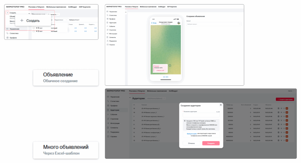 МТС Маркетолог PRO устроен иначе. Это отдельная платформа, через которую вы запускаете рекламу в Telegram. Здесь можно использовать сегменты Big Data от 65 миллионов абонентов, загружать собственные аудитории, настраивать автоматические стратегии, управлять кампаниями через Excel и получать полноценную обратную связь от модераторов, если объявление отклонили.