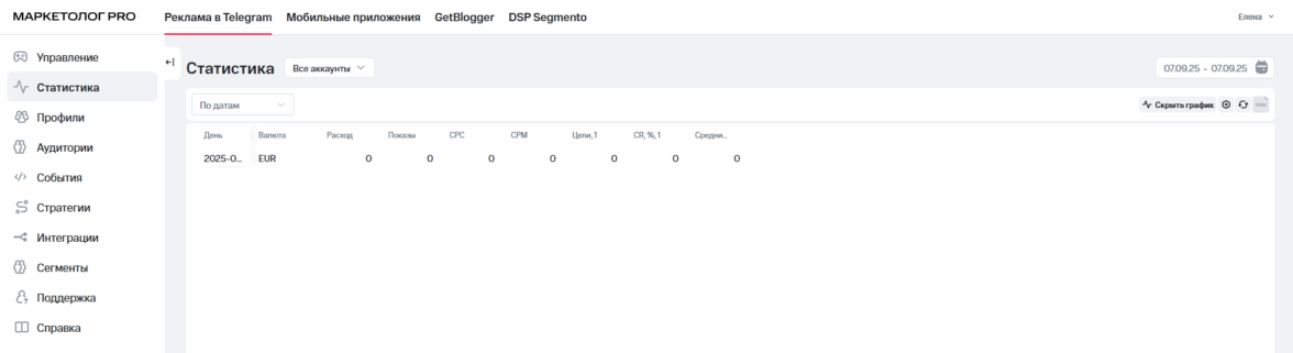 Аналитику по кампаниям можно посмотреть в разделе «Статистика». Здесь доступны все ключевые показатели: показы, клики, охваты, стоимость, CTR, CPC, CPM, CR и конверсии. Удобно, что данные можно отфильтровать по дате, аккаунту или конкретному объявлению — например, чтобы сравнить эффективность разных креативов или сегментов.