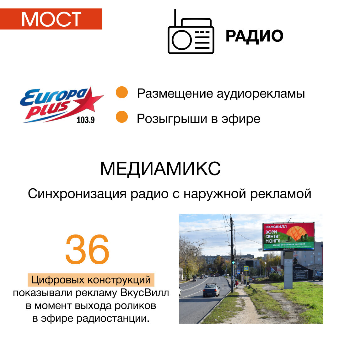 Для усиления рекламного эффекта использовалась технология «Медиамикс» — синхронизация выходов рекламных роликов на радио и на цифровых билбордах. При этом рекламный ролик транслируется на всех (на тот момент 36) экранах рекламного агентства «МОСТ» в Нижнем Новгороде. Таким образом мы увеличили охват рекламной кампании.