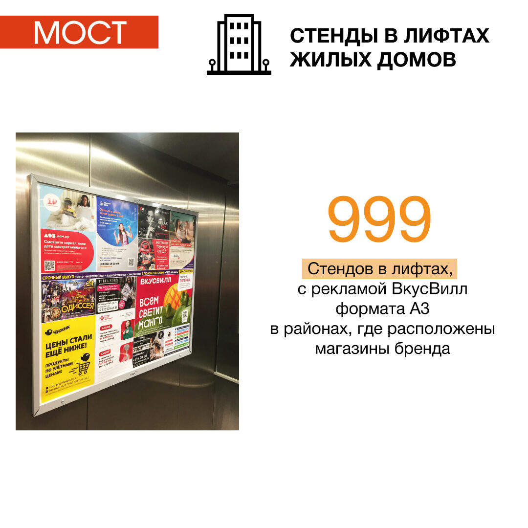 Во всех районах, где расположены магазины ВкусВилл, мы разместили рекламу на 999 стендах в лифтах жилых домов. Формат был выбран максимально заметный — А3. Реклама в лифтах обеспечивает многократный контакт целевой аудитории с рекламой, а также дает возможность взаимодействовать с рекламным объявлением: перейти по qr-коду, зайти на сайт, сфотографировать промокод и т.д.