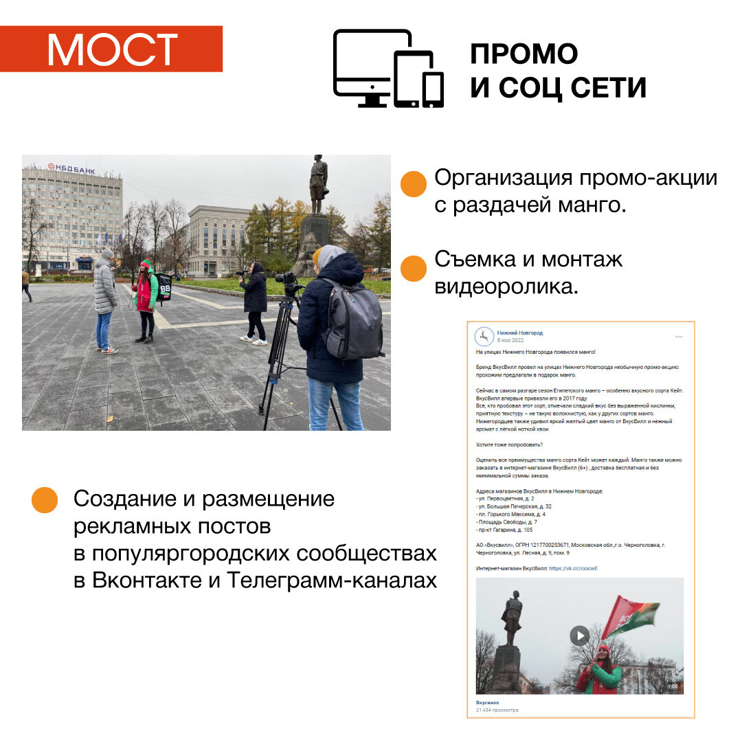 Еще одной важной составляющей мультиканальной рекламной кампании стало проведение промо-мероприятий. На центральной улице города — площади Горького — в течении нескольких дней промоутеры в специальной брендированной форме брали интервью у прохожих и раздавали манго. По итогу акции был смонтирован видеоролик, который мы разместили в популярных городских сообществах Вконтакте и в телеграмм-каналах.