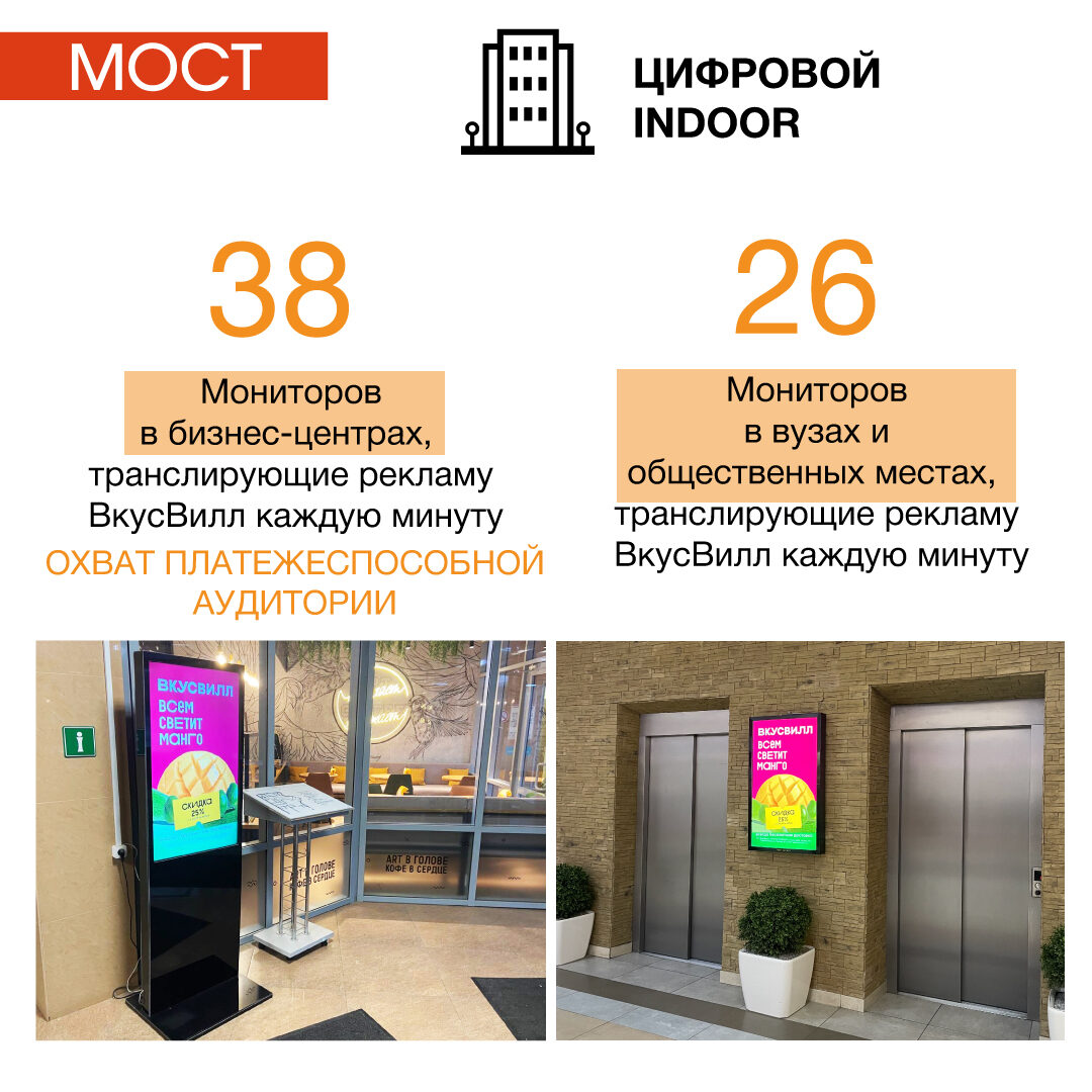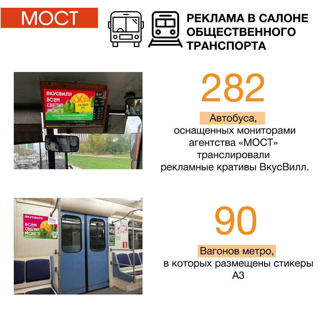 Внутри салона автобусов пассажиры наблюдали рекламу ВкусВилл на цифровых мониторах «МОСТа». Такой формат позволил оперативно менять рекламные креативы в течении одной рекламной кампании. Всего было задействовано 282 автобуса.