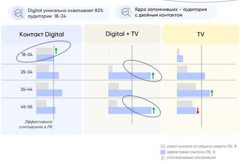 Самую высокую запоминаемость сообщения у людей в возрасте 25-34 года и 45-55 лет обеспечило одновременное размещение на ТВ и в интернете. При этом реклама в сети дала самый большой уникальный охват молодежи в возрасте 18-24 года: он оказался выше ожидаемого и составил 83%.