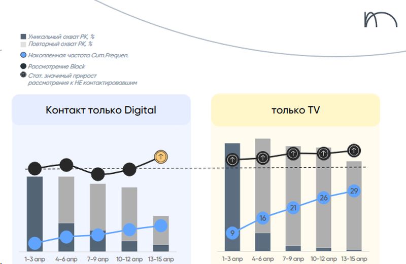 Исследователь и банк поделились выводами о том, как работает кросс-канальное продвижение по фактам контактов с аудиторией на ТВ, в интернете и в Telegram. Чтобы определить факт контакта, организаторы кампании использовали сервис для прометки рекламных сообщений Adriver, данные измерителя телеаудитории MediaHills (принадлежит Mediascope) и исследовательской компании Tiburon Research (Tiburon ID).