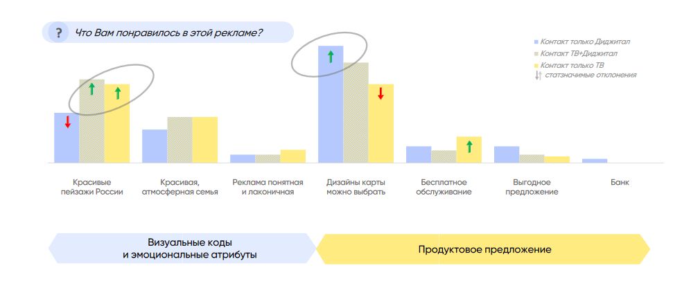 Итоги кампании не подтвердили распространенное мнение будто потребители в последнюю очередь обращают внимание на дизайн банковской карты. Выяснилось, что если говорить об эмоциональных атрибутах бренда и продуктовом предложении, то при выборе карты «Т-Банка» изображенные на ней пейзажи России вместе с возможностью выбрать дизайн стали для целевой аудитории одними из наиболее значимых составляющих.