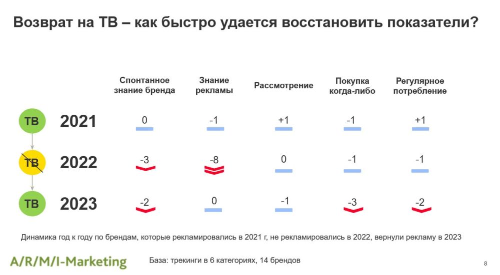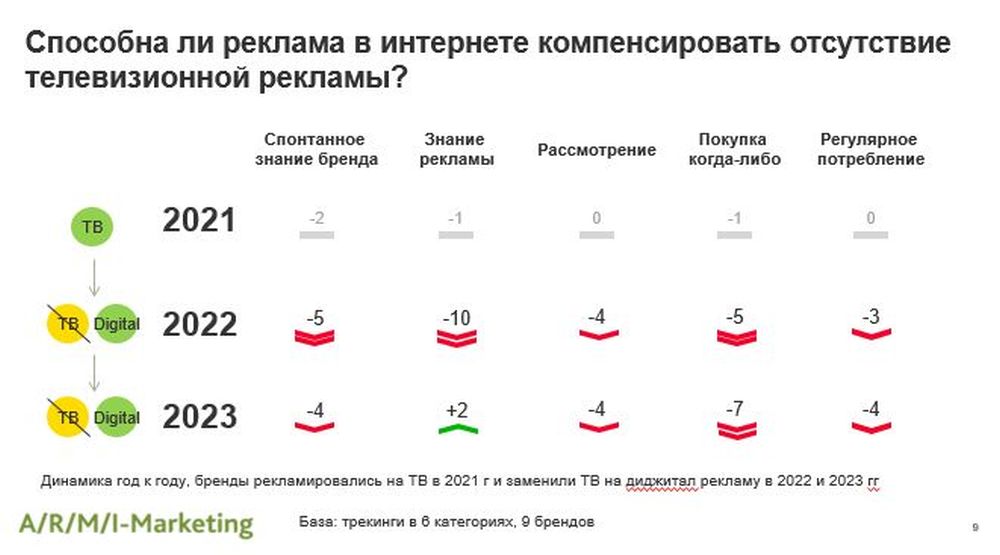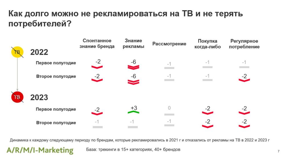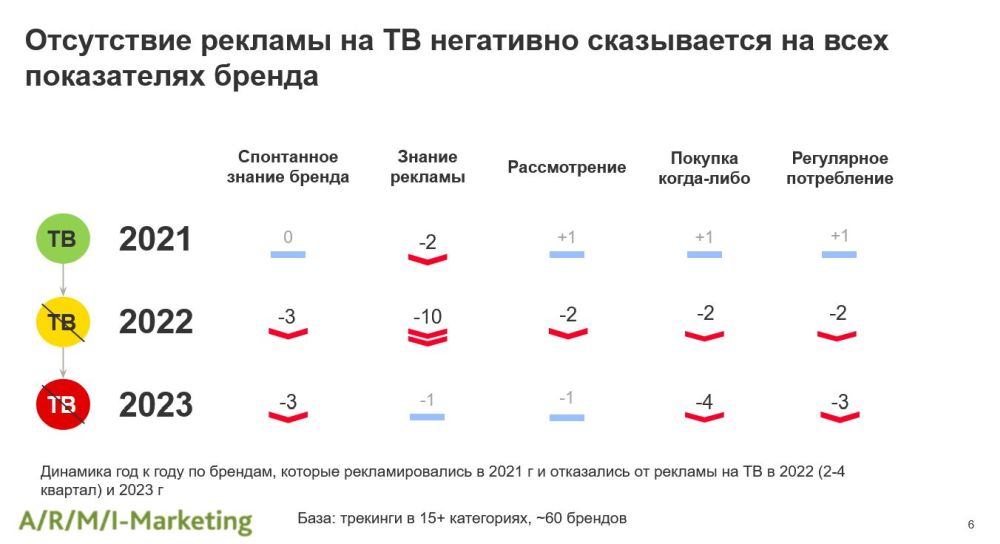 Агентство «АРМИ-Маркетинг» агрегировало ряд исследований, проведенных в 2021-2023 годах для более чем 300 брендов в 20 товарных категориях. Исследователи выясняли, как отсутствие рекламы на ТВ сказалось на метриках брендов, как долго бренды могут не рекламироваться на ТВ и не терять при этом в показателях, а также способна ли интернет-реклама компенсировать отсутствие активности на ТВ.