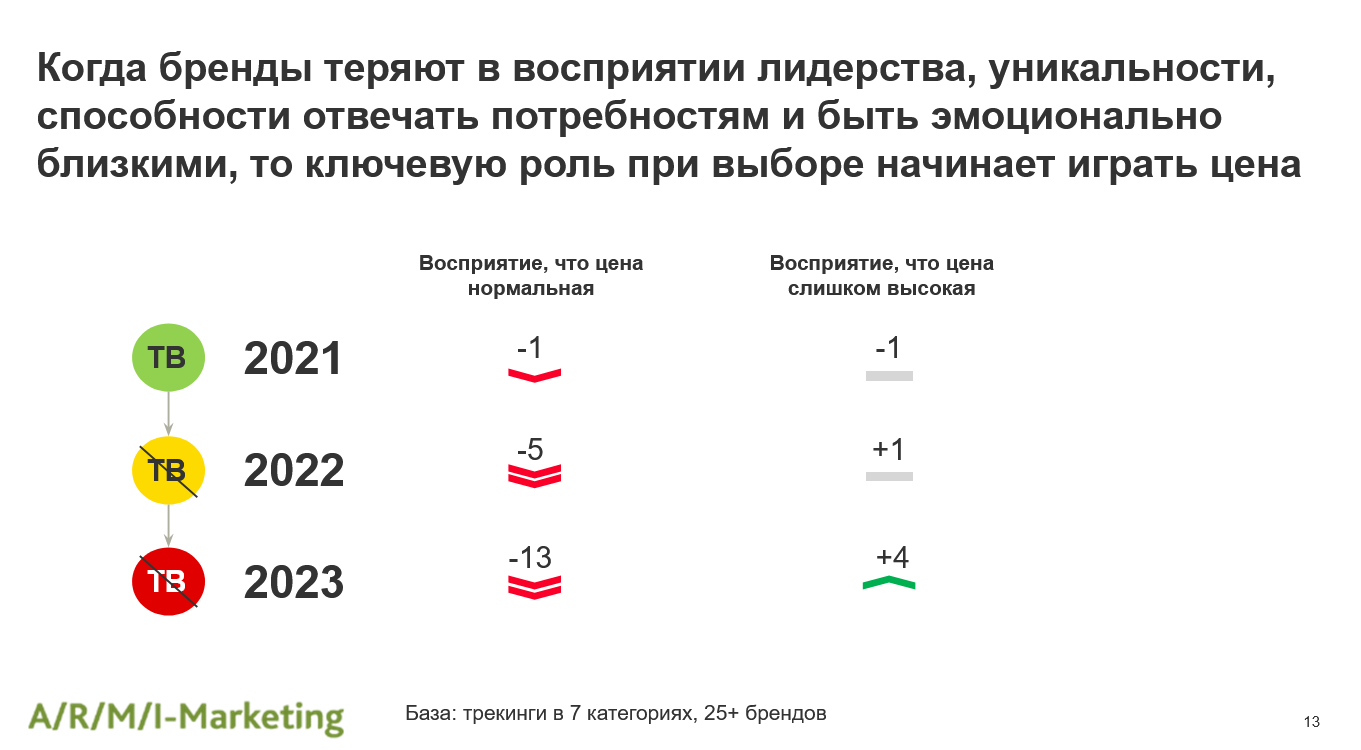 Сильнее всего на фоне отсутствия рекламной поддержки страдает имиджевое восприятие бренда. У брендов хуже получается оправдывать свою стоимость, потребители все чаще отказываются платить дополнительные деньги, чтобы получить лучшее качество. «Когда бренды теряют в восприятии лидерства, уникальности, способности отвечать потребностям и быть эмоционально близкими, то ключевую роль при выборе начинает играть цена», — считают исследователи «АРМИ-Маркетинг».