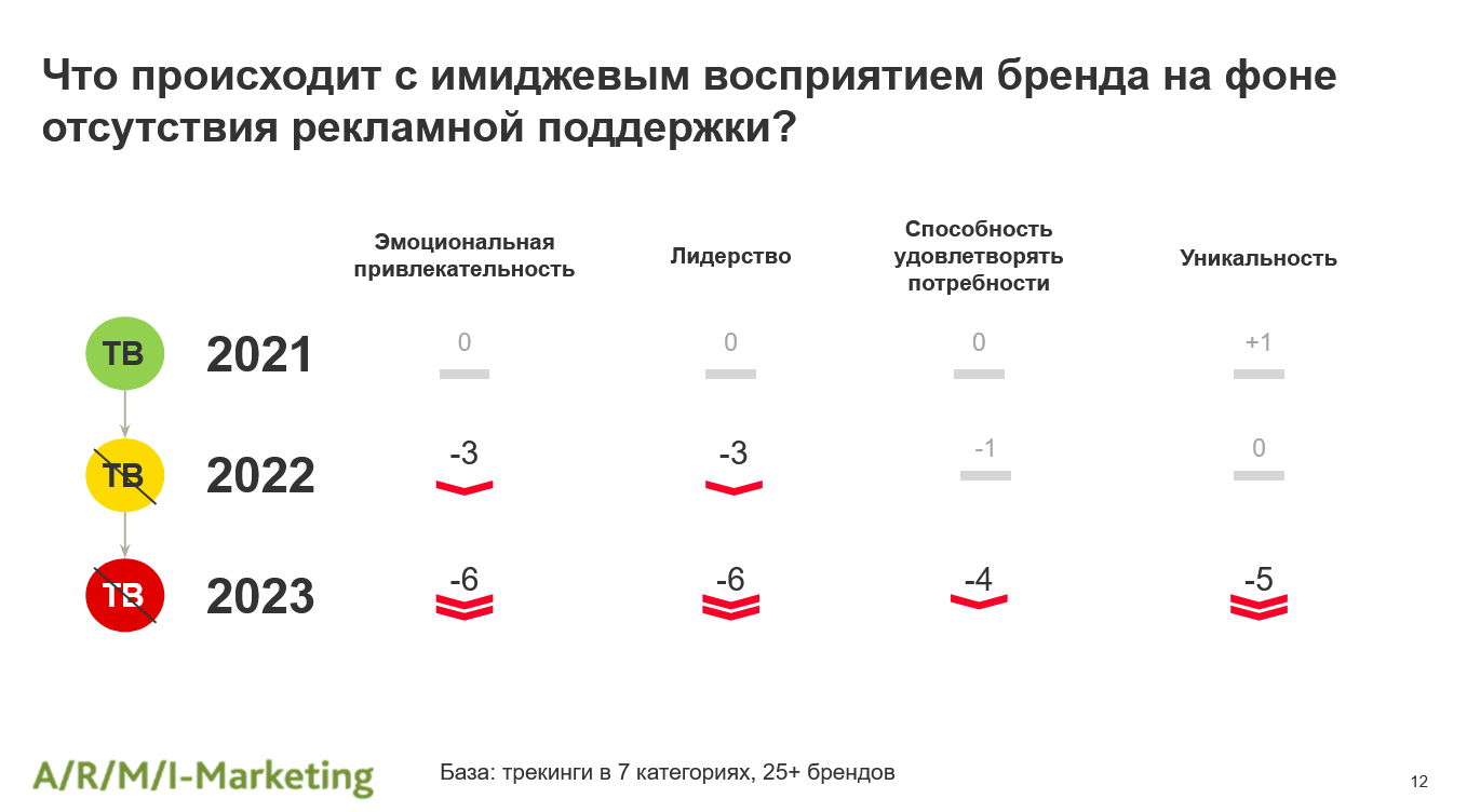 По наблюдениям «АРМИ-Маркетинг», падение в знании бренда при отсутствии ТВ-рекламы наблюдалось в первые же полгода. Показатели покупки и потребления в течение шести месяцев показывали менее выраженную негативную динамику, но затем в условиях отсутствия телерекламы начинали снижаться с ускорением.