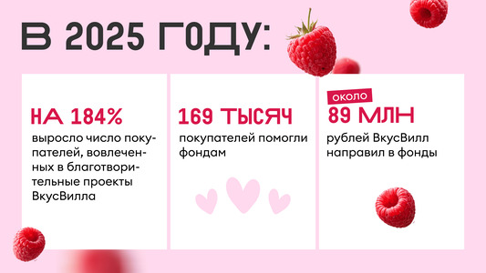 ВкусВилл оказал продуктовую поддержку 3,5 тысячам людям, находящимся в тяжелой жизненной ситуации, и 1,7 тысячам бездомным животным из приютов. За 2025 год покупатели ВкусВилла поставили рекорд и собрали более 9 миллионов рублей, что в 1,5 раза больше, чем в прошлом году.