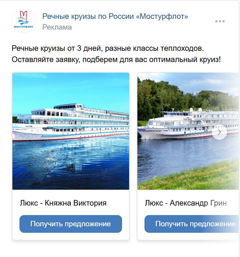 Реклама, которая будет направлена на привлечение новой аудитории. Необходимо будет написать продающую статью, в которой будут представлены все бонусы и преимущества планирования отпуска именно с Мостурфлотом. В конце мы дадим тест, чтобы пользователи могли подобрать идеальный круиз, не переходя на сайт. Таким образом, к середине навигации получим новую аудиторию, которая заинтересована в круизах;