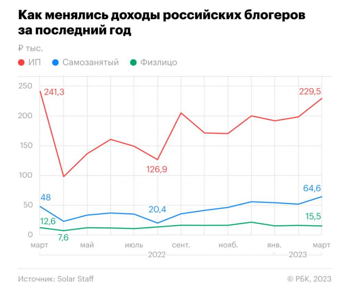 Единственная категория блогеров, чьи доходы в первом квартале 2023 года снизились, — инфлюенсеры, имеющие статус индивидуального предпринимателя (ИП). В среднем они зарабатывают за месяц на порядок больше, чем блогеры-физлица или самозанятые — 206,7 тыс. рублей. При этом, их меньше всех — всего 0,5-1%. За первый квартал текущего года их доходы сократились почти на четверть (-24% год к году) и на 49% по сравнению с началом 2021 года. По мнению Solar Staff. снижение доходов блогеров-ИП отчасти связано с их релокацией: «Многие блогеры закрыли свои ИП в России и переехали, чтобы не потерять возможность работать с зарубежными заказчиками».
