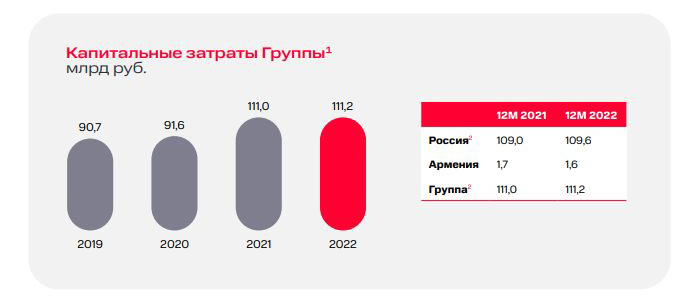 В 2022 году крупнейшая «операторская» экосистема — группа МТС —инвестировала в инфраструктуру и цифровую экосистему 111,2 млрд рублей. Сумма практически не изменилась с 2021 года (было 111 млрд рублей). В марте 2023 года МТС объявила, что вложит в стартапы, которые усилят продукты и вертикали экосистемы, 1 млрд рублей. Сумма инвестиций в один проект составит от $0,5 до $5 млн.