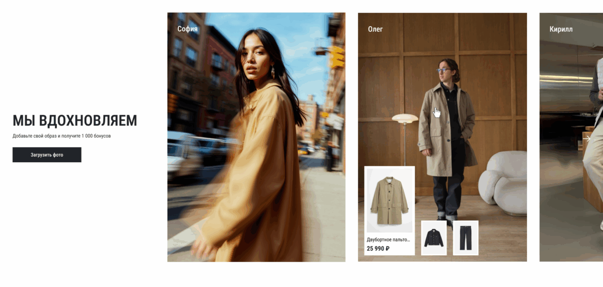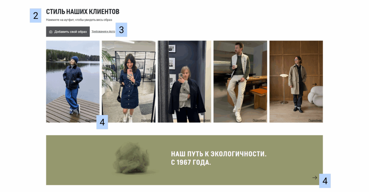 Видоизменили один из имеющихся блоков — «образы клиентов». Сейчас это простые некликабельные фотографии. Мы же решили и «замотивировать» пользователей делиться своими образами и добавить интерактива.