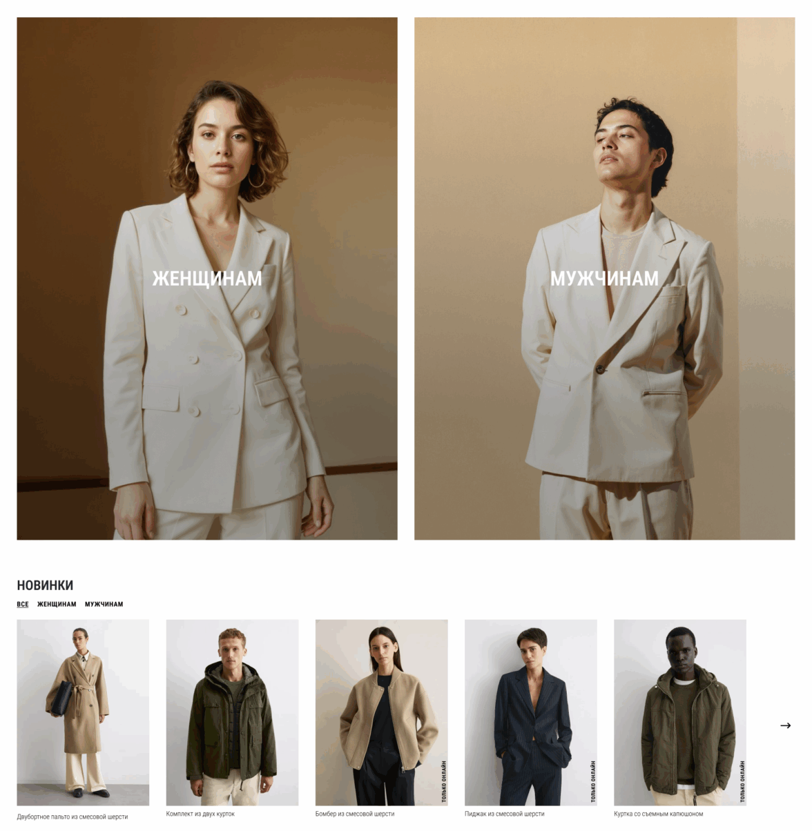 Странное решение с показом сверху новинок в коллекции с разделением по полу, а после снова новинки (но уже другие) и снова разделение по полу)