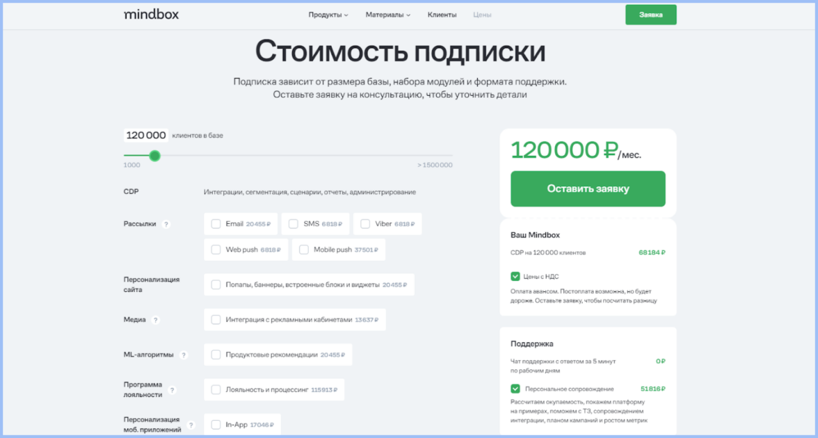 На сайте MindBox есть калькулятор, с помощью которого вы можете рассчитать стоимость подписки под потребности именно вашего бизнеса.
