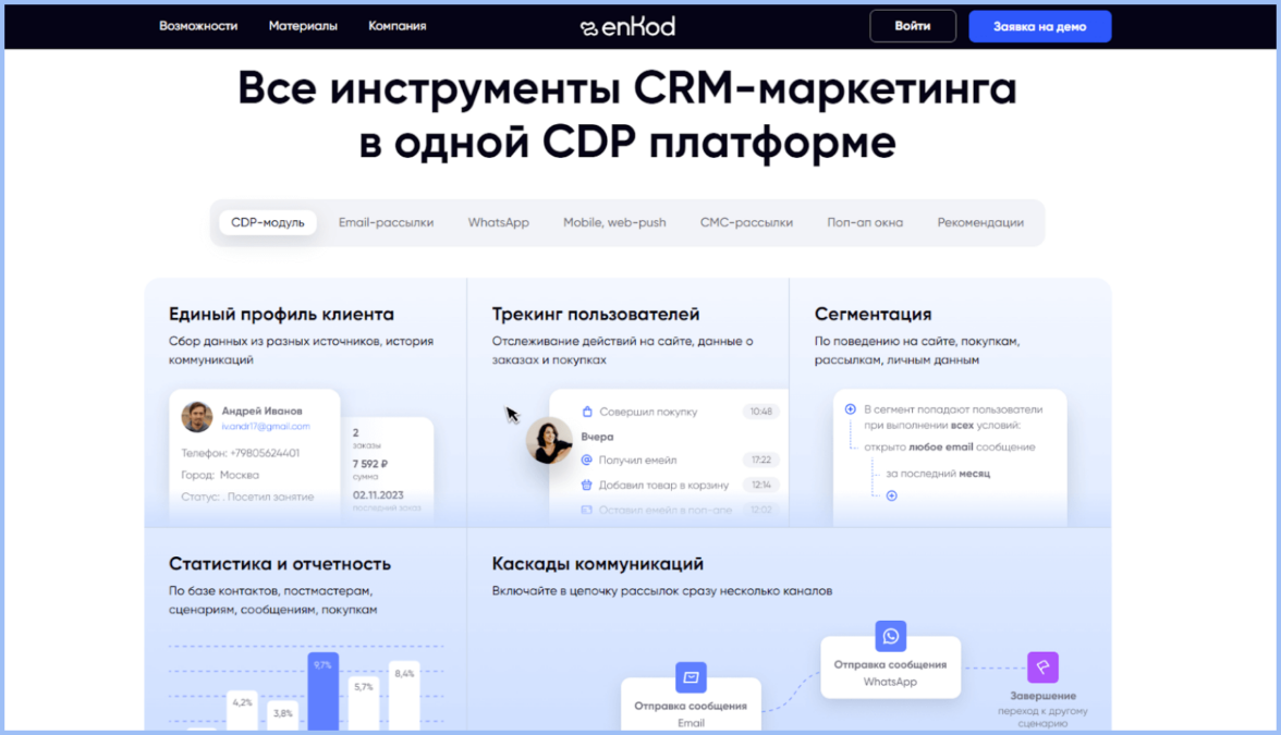 enKod — CDP-платформа, которая помогает сделать рассылки эффективнее, не прибегая к ручной работе, имеет инструменты для автоматизации и персонализации отправок, всплывающие окна и сервис товарных рекомендаций.