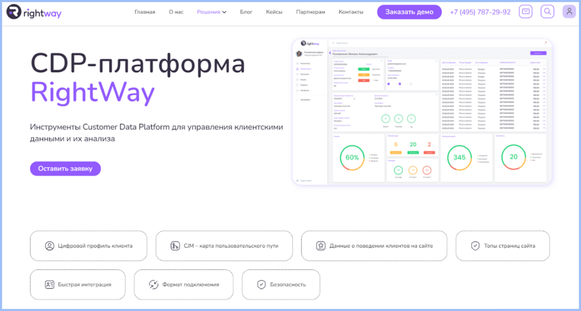 RightWay — модульное решение для автоматизации маркетинга и управления лояльностью клиента. Включает в себя CDP-модуль для работы с клиентскими данными, модуль для CRM-маркетинга, процессинг лояльности, инструменты коммуникации, аналитики и клиентские сервисы.
