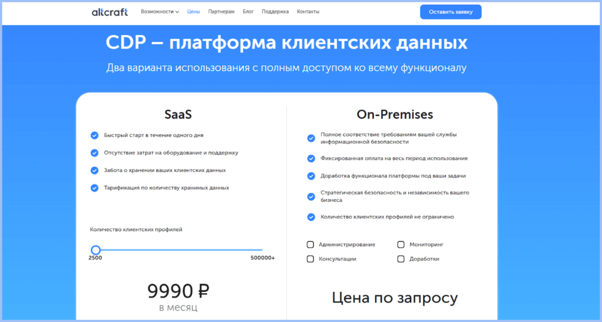 В Altcraft есть два варианта использования: SaaS и On-Premise — с полным доступом к функционалу.