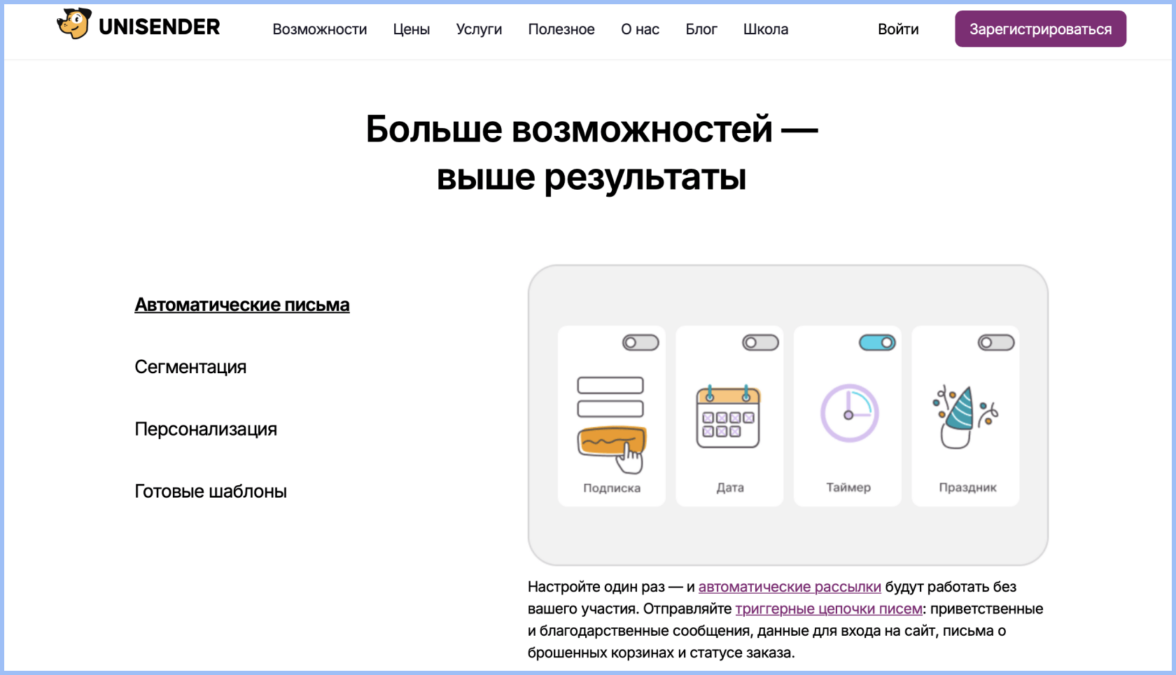 Имеется гибкая система автоматизации, так называемые «кампании», с помощью которых можно настроить любые цепочки сообщений, начиная от простейших приветственных и заканчивая сложными «ветками» с этапами сегментации, изменения данных и автоматизированными А/В тестами.