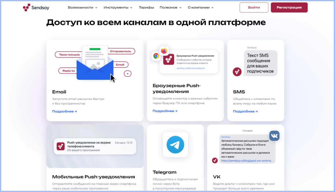 Однозначным плюсом платформы является многоканальность — email, SMS, push-уведомлений и сообщений в мессенджерах (Telegram, VK).