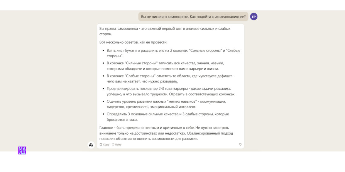 В области саморазвития нейросети тоже отличные помощники. Хотите поднять самооценку, нейросеть Claude может помочь.
