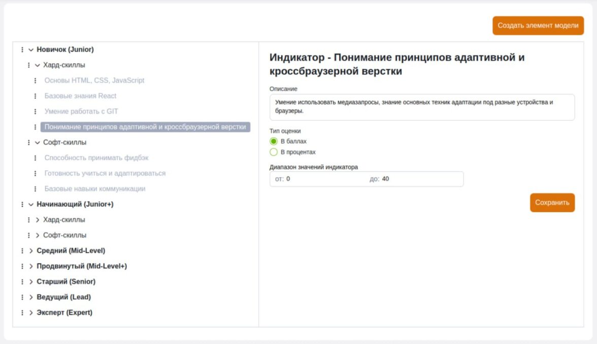 Внешний вид матрицы компетенций на платформе Distant Global. В ее настройках HR-специалист может задавать индикаторы, отслеживать уровни и компетенции сотрудников