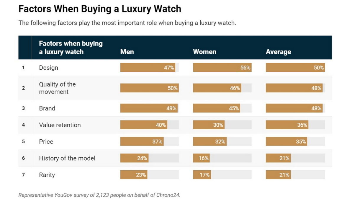 Раздумывая над покупкой дорогих часов, мужчины и женщины принимают в расчет разные факторы. Для женщин важнее всего дизайн: именно на него обращают внимание 56% из них. Все остальные параметры важнее мужчинам. Качество работы механизма — 50% (для женщин — 46%). Бренд — 49% (45%). Сохранение стоимости со временем — 40% (30%). Цена — 37% (32%). История модели — 24% (16%). Раритетность — 23% (17%).