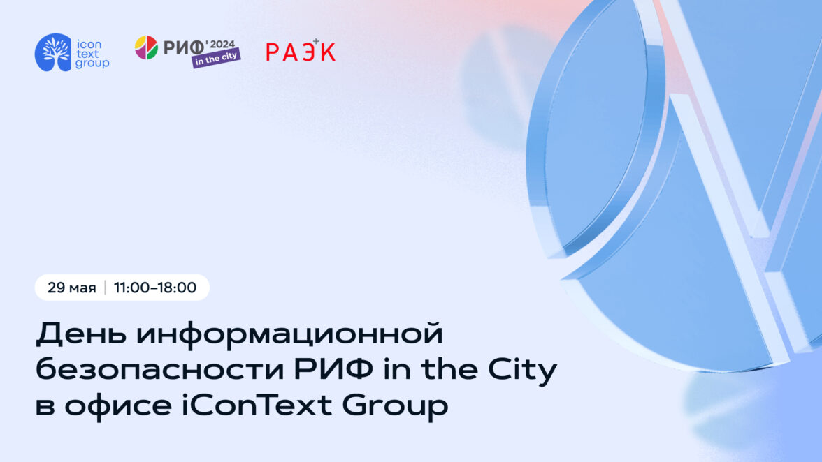 День информационной безопасности РИФ in the City пройдет 29 мая с 11:00 до 18:00 в офисе iConText Group по адресу г. Москва, ул. Новослободская, 16, 3 этаж. Регистрация начнется в 10:00.