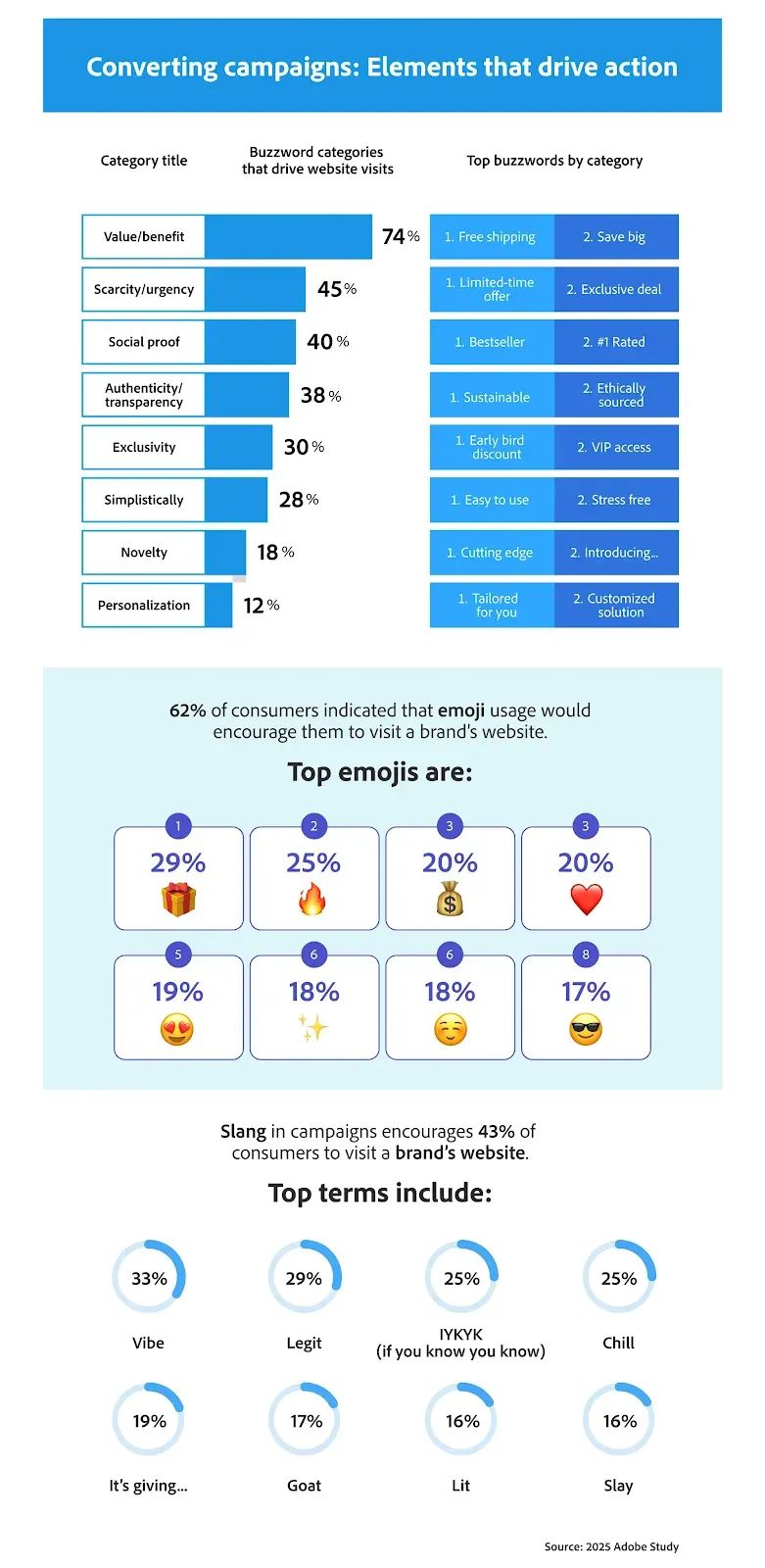 Adobe определила, какой контент, визуальные элементы, слова и фразы должны использовать рекламодатели, чтобы привлечь внимание потребителей. Наиболее привлекательный контент — короткие видео, ключевики для внимания — «бесплатная доставка» и «экономьте по-крупному». Рейтинг эмодзи составили подарки и огоньки, а сленговых слов — вайб, легальный (legit) и аббревиатура IYKYK.