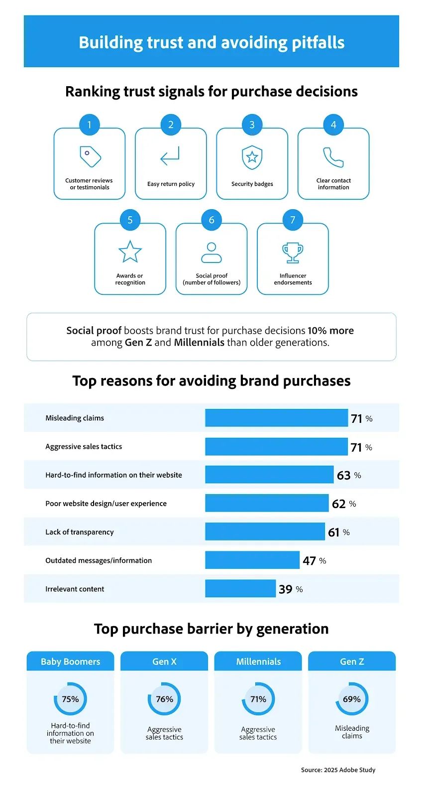 И, наконец, финальное открытие, сделанное Adobe на основе ответов респондентов, — «сигналы доверия», которые помогают брендам завоевать преданность аудитории. Для большинства доверие формируют отзывы пользователей, простые правила возврата товаров, значки о безопасности продукции бренда и полная контактная информация.