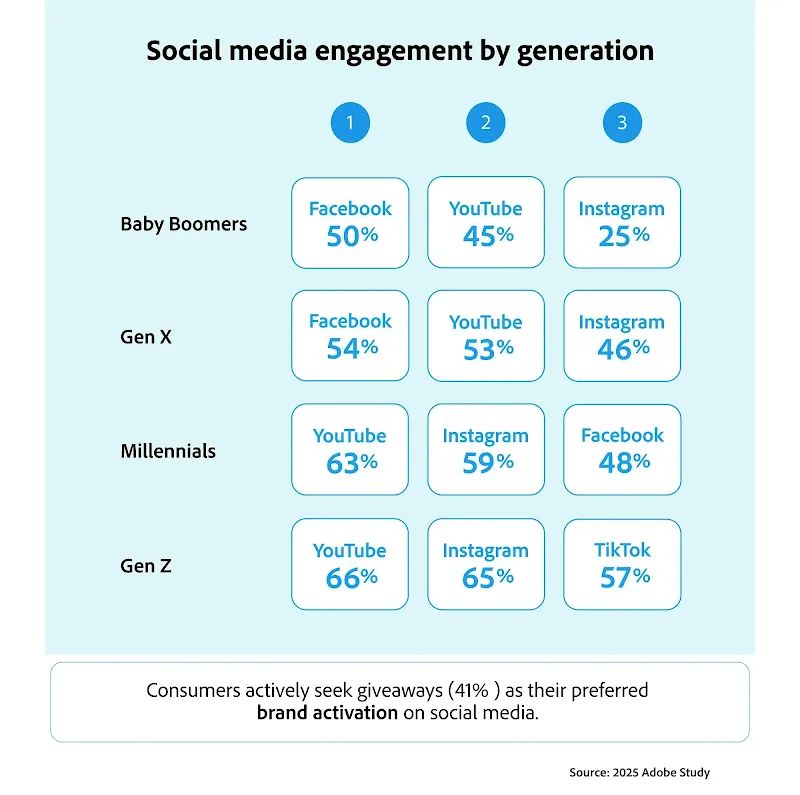 В отношении социальных сетей, в которых пользователи хотят взаимодействовать с брендами, мнения разошлись. Бэби-бумеры и поколение X в основном взаимодействуют с брендами на Facebook*, а миллениалы и зумеры больше тяготеют к YouTube. Старшим группам потребителей больше нравятся длинные видео, молодым — короткие.