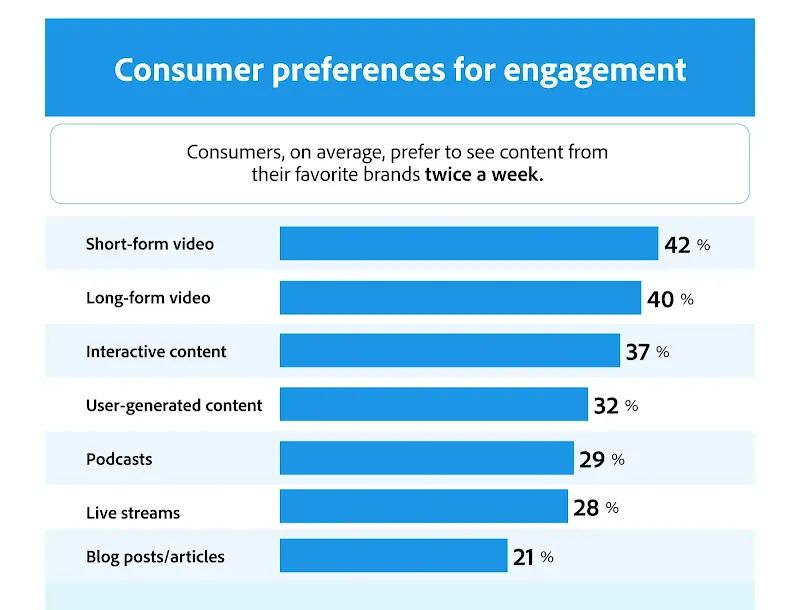 Главные типами контента, который американцы, опрошенные Adobe, хотят видеть в коммуникации брендов, — привлекательный визуальный контент. Формат коротких видео предпочитают 42% респондентов, длинных роликов — 40%, интерактивный контент — 37%.