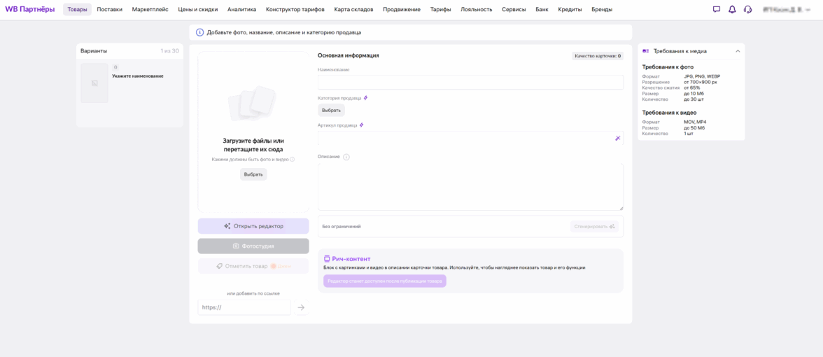 Для этого зайдите в раздел «Товары», выберите «Карточки товаров» и нажмите кнопку «Добавить». Важно внимательно заполнять все поля: от названия товара до характеристик. От этого зависит, как будет выглядеть ваш товар на маркетплейсе.