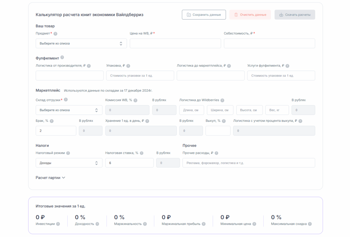Внесите данные в калькулятор: категория товара, цена продажи (ориентируйтесь на конкурентов, чтобы не завышать стоимость), себестоимость товара, габариты и упаковка (короб или паллета), налогообложение (например, УСН 6%), клад для отгрузки (например, Коледино).