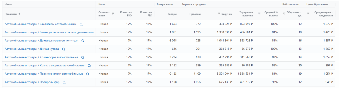 Если вы хотите углубиться в анализ, используйте специальные сервисы. Там есть инструмент «Анализ ниш», который помогает выбрать категорию по таким критериям, как количество конкурентов, цена, рейтинг, процент возвратов, выручка и др. Это удобно для новичков, которые еще не знают, с чего начать.