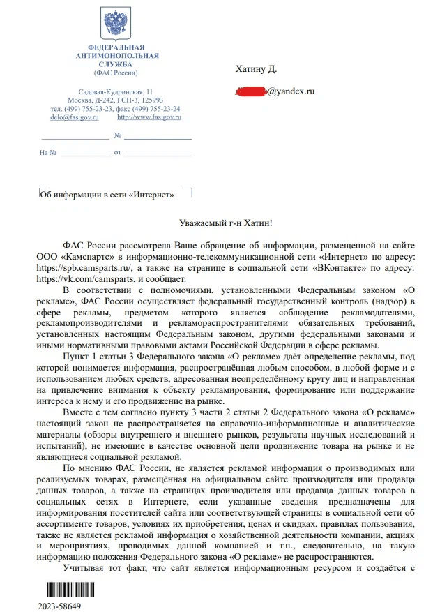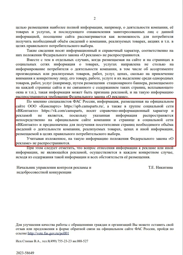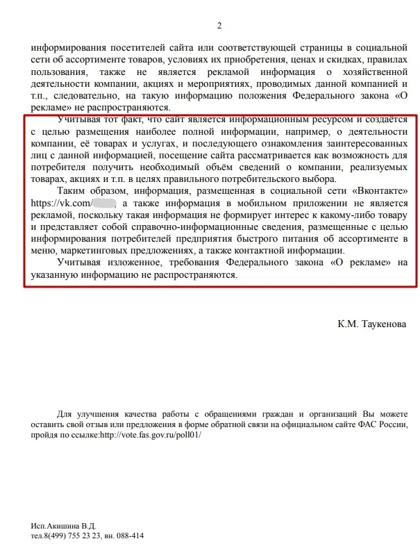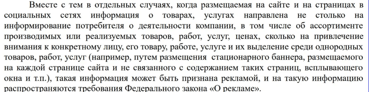 По сути, ФАС дал аналогичную трактовку и обозначил свою позицию в отношении сайтов и постов в соцсетях для Додо-пицца, так же как и для Камспартс (см. выше)