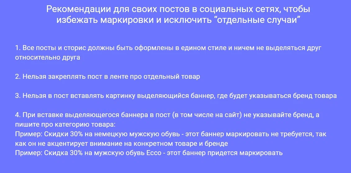 Как мы видим, во всех баннерах указаны общие формулировки в баннерах. Упоминаются только категории товаров и нигде не присутствует (в приведенных примерах) упоминание бренда и конкретного товара. Такие баннеры маркировать не требуется и с легкостью можно использовать в постах соцсетей.