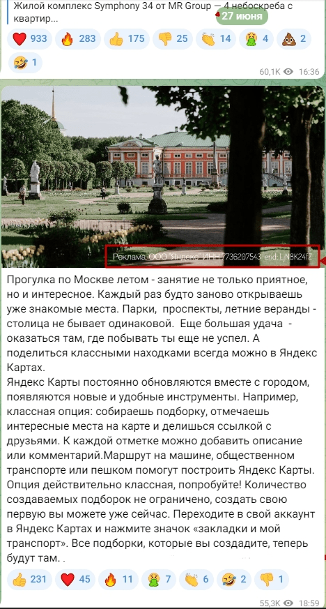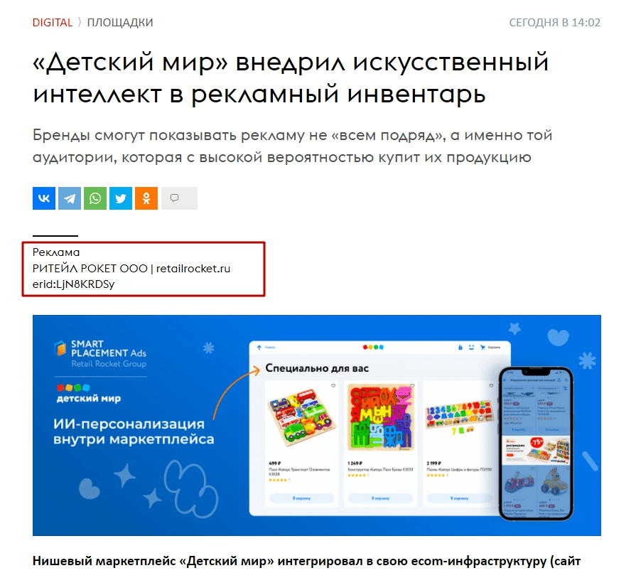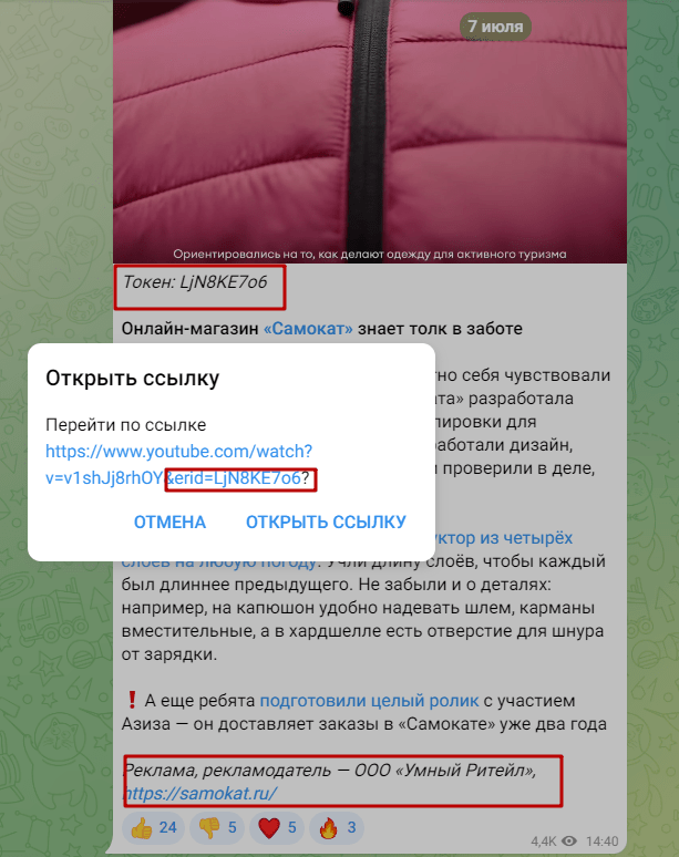 В посте атрибуты маркировки расположены верно и без ошибок. Однако, если перейти (см. картинку ниже) по указанной ссылке (это не ссылка на интернет-ресурс рекламодателя, а на статью рекламодателя на сайте рекламораспространителя), то увидим, что статья также как необходимо промаркирована, НО НО НО в ней указан тот же самый токен, как и в посте соцсети (см. картинку выше). Это ошибка. Статья это отдельный формат, а токен должен быть оформлен для каждого формата свой — уникальный. В итоге нужно было для поста свой токен, а для статьи другой токен. За это Роскомнадзор будет штрафовать.