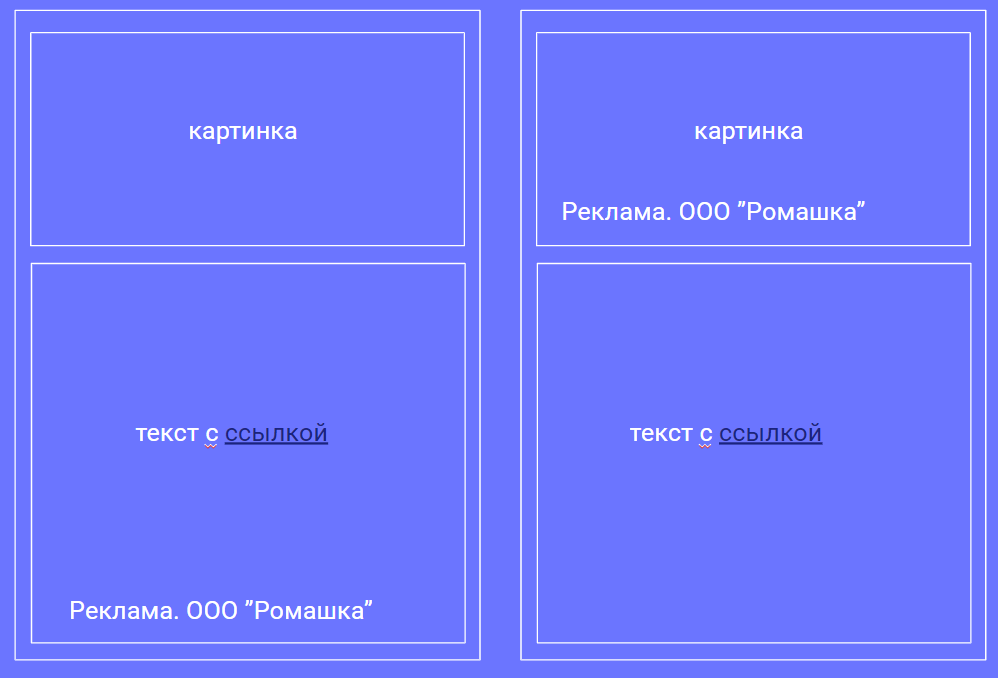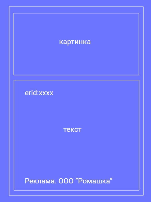 В данном случае атрибуты Реклама. ООО «Ромашка» нанесены на баннер, а токен указывается в начале текстового блока. Такой вариант также приемлем