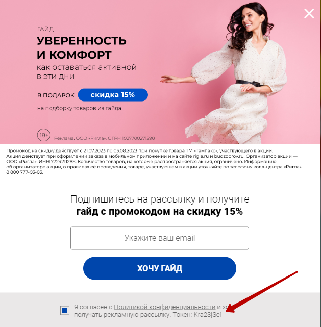 Это всплывающий баннер на первой страницы сайта. Все атрибуты маркировки рекламы указаны. Однако аббревиатура токена прописана на кириллице. Робот Роскомнадзора не сможет его считать. Надо только так — erid. В итоге ошибка и возможный штраф.