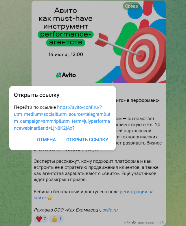 Как мы видим, здесь в наличии все атрибуты маркировки, но не прописан erid: у токена. Да, как таковой токен присутствует в самом конце текста, но без указания erid. Робот Роскомнадзора (ЕРИР) его просто не считает. Это ошибка.