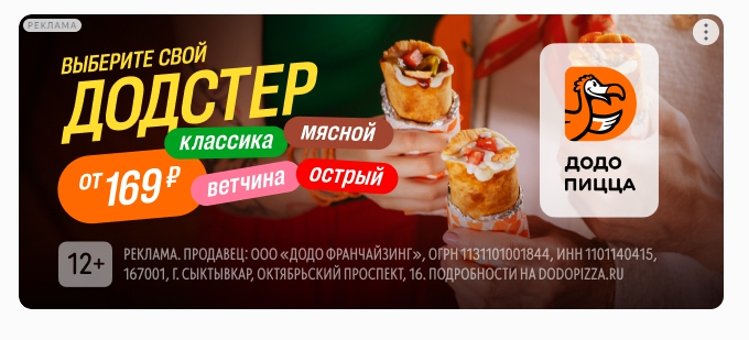 Здесь с помощью меню баннера были зашиты все необходимые атрибуты маркировки рекламы. Я специально выделил данный баннер в отдельный пример (системно он напоминает Пример №1). Суть в том, что этот баннер размещается через систему Яндекс Директ. При копировании ссылки либо при переходе по клику на баннер вы нигде не увидите токена erid в ссылке. Дело в том, что по разрешению Роскомнадзора каждая ОРС (оператор рекламных систем) может кодировать ссылку. При ее расшифровке на сервере ЕРИР (единый реестр интернет рекламы — продукт Роскомнадзора) будет распаковываться тот самый токен erid, который был получен в ОРД. Указанный в баннере ЕРИР #….., по видимому, и есть тот самый ключ для расшифровки.