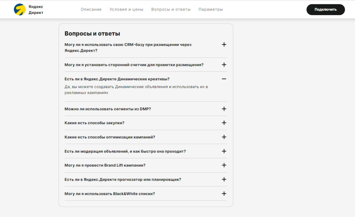 Например, вот как выглядит блок «Вопрос — ответ» для Яндекс Директа ↓