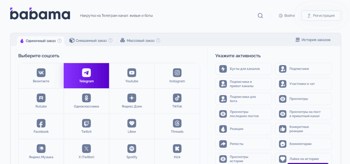 Babama — универсальная площадка: можно запускать массовые, одиночные или смешанные заказы, а еще подключить автолайки по подписке.