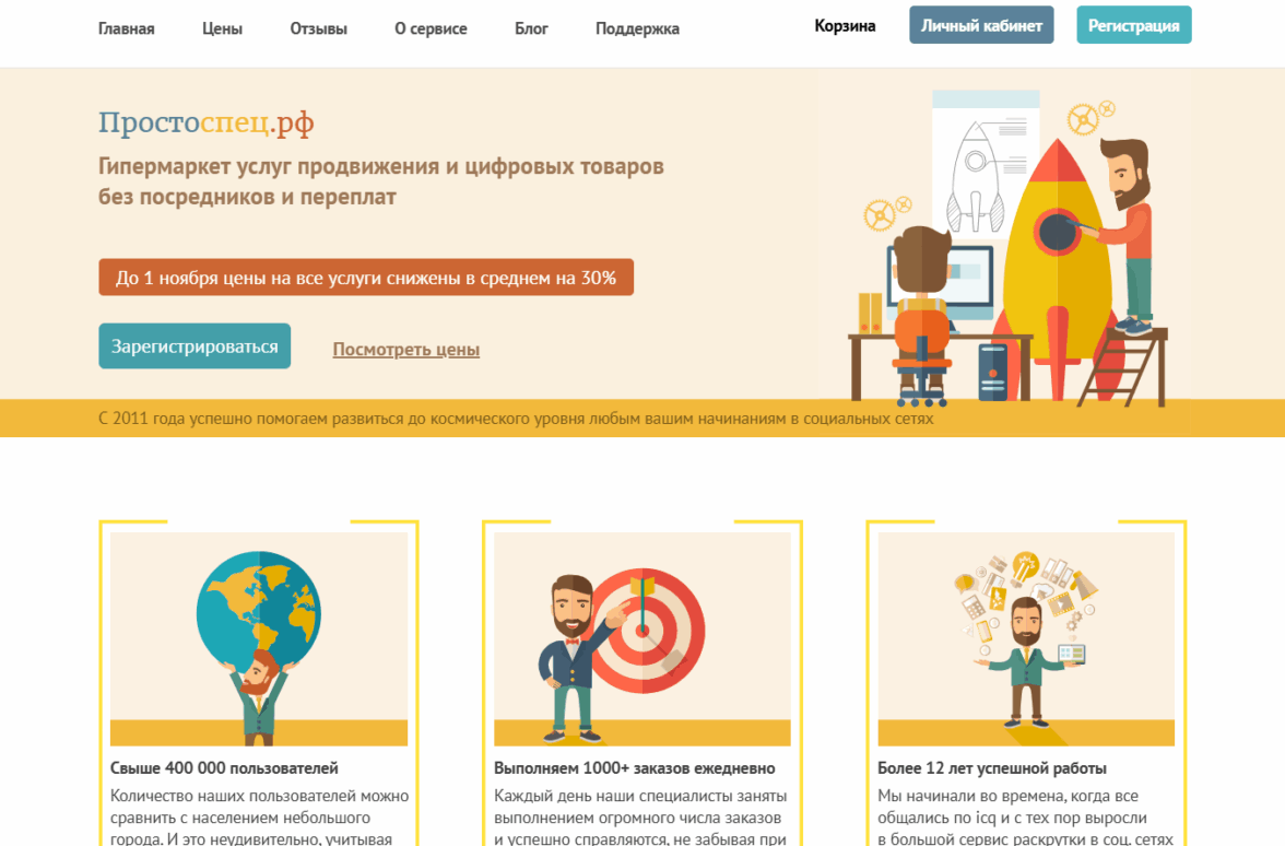 Простоспец — один из старейших сервисов накрутки с низкими ценами и большим выбором услуг.