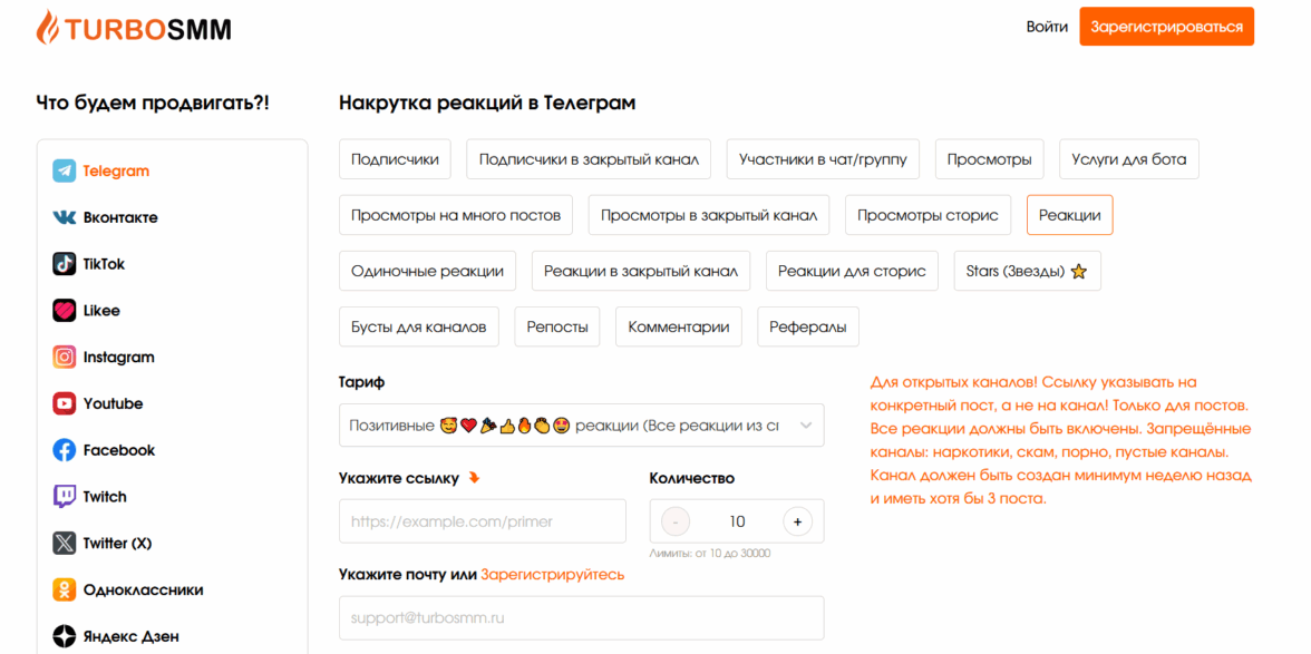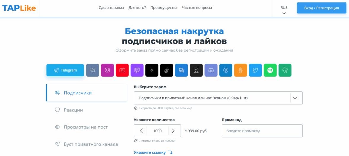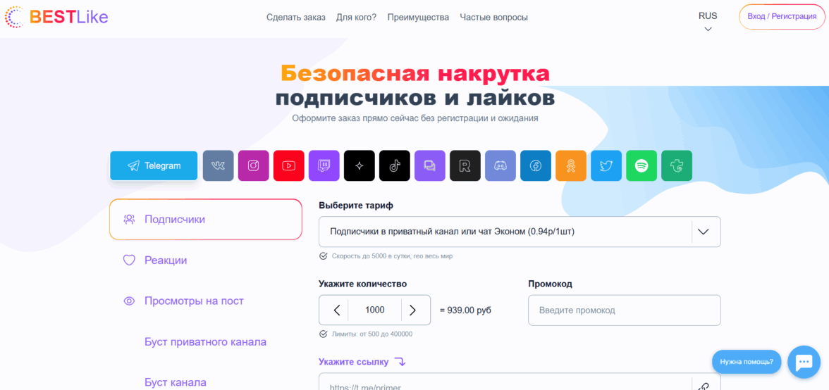 Регистрация: для разового заказа не нужна, но личный кабинет открывает больше функций — подписки на автолайки и просмотры, бонусные тарифы и управление активными заказами